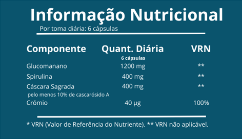 Amorphophallus konjac (Glucomanano), Spirulina maxima (Spirulina), gelatina, Rhamnus purshiana DC (Cáscara Sagrada; extrato da casca contendo pelo menos 10% de cascarósido A), agente de volume: celulose microcristalina, antiaglomerantes: sais de magnésio de ácidos gordos, dióxido de silício, cloreto de crómio.