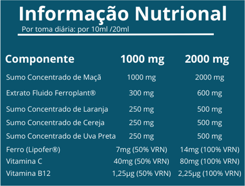 Água desmineralizada, sumo concentrado de maçã (Malus domestica), extrato fluido Ferroplant ® (água, algas marinhas: Fucus vesiculosus, talo; cavalinha: Equisetum arvense, partes aéreas; grama: Cynodon dactylon, raiz; urtiga: Urtica dioica, raiz; funcho: Foeniculum vulgare, frutos; laranja amarga: Citrus sinensis, frutos; tanchagem: Plantago major, planta; mil-folhas: Achillea millefolium, folhas e flores; zimbro: Juniperus communis, frutos; espinafre: Spinacia oleracea, folhas), sumo concentrado de laranja (Citrus sinensis), sumo concentrado de cereja (Prunus cerasus), sumo concentrado de uva preta (Vitis vinifera), pirofosfato férrico (Lipofer ® ), ácido L-ascórbico, aroma de laranja, conservante: sorbato de potássio, regulador de acidez: ácido cítrico anidro, edulcorante: sucralose, cianocobalamina (0,1%).
