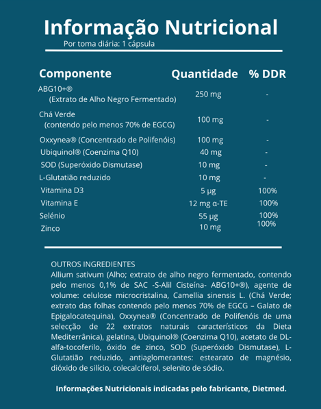 Allium sativum (Alho; extrato de alho negro fermentado, contendo pelo menos 0,1% de SAC-S-Alil Cisteína – ABG10®); Agente de volume: celulose microcristalina; Camellia sinensis L., (Chá Verde; extrato das folhas contendo pelo menos 70% de EGCG – Galato de Epigalocatequina); Oxxynea® (concentrado de polifenóis de uma selecção de 22 extratos naturais característicos da Dieta Mediterrânea); Gelatina; Ubiquinol® (Coenzima Q10); Acetato de DL-alfa-tocoferilo; Óxido de zinco; SOD (Superóxido Dismutase); L-Glutatião reduzido; Anti aglomerantes: estereato de magnésio, dióxido de silício, colecalciferol, selenito de sódio.