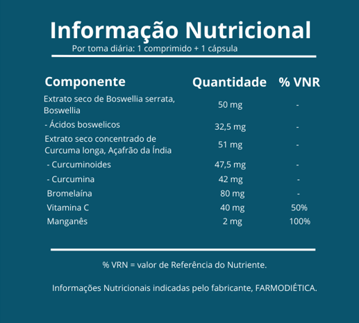 Contém 50 mg de extrato seco de Boswellia serrata (32,5 mg de ácidos boswelicos) e 51 mg de extrato seco concentrado de Curcuma longa (47,5 mg de curcuminoides e 42 mg de curcumina), conhecidos por suas propriedades anti-inflamatórias e antioxidantes. Inclui ainda 80 mg de bromelaína, que reduz a inflamação, e 40 mg de vitamina C, essencial para a síntese de colágeno. O manganês, presente em 2,0 mg, é crucial para o metabolismo ósseo e a formação de tecido conjuntivo.