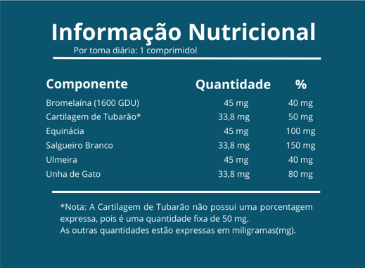 Salix alba (salgueiro branco; casca), agente de volume: celulose microcristalina, Uncaria tormentosa (unha de gato; casca), cartilagem de tubarão*, agente de volume: amido modificado demilho, bromelaína (1600 GDU), Filipendula ulmária (ulmária; flores), antiaglomerante: fosfato dibásico de cálcio anidro, Echinacea angustifólia (equinácia; extrato seco 5:1 da raiz), Uncaria tormentosa (unha de gato; extrato seco), antiaglomerantes: estearato de magnésio, dióxido de silício. *Produto à base de peixe.