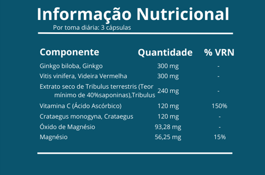 Ginkgo biloba, Ginkgo Vitis vinifera, Videira Vermelha Extrato seco de Tribulus terrestres (Teor mínimo de 40% saponinas), Tribulus Vitamina C (Ácido Ascórbico) Crataegus monogyna, Crataegus Óxido de Magnésio (Magnésio).