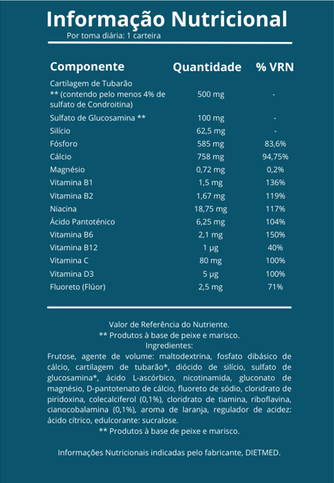 Frutose, maltodextrina, fosfato dibásico de cálcio, cartilagem de tubarão*, dióxido de silício, sulfato de glucosamina**, ácido L-ascórbico, nicotinamida, gluconato de magnésio, D-pantotenato de cálcio, fluoreto de sódio, cloridrato de piridoxina, colecalciferol (0,1%), cloridrato de tiamina, riboflavina, cianocobalamina (0,1%), aroma de laranja, regulador da acidez: ácido cítrico, edulcorante: sucralose. *Produtos à base de peixe. **Productos a base de crustáceos.
