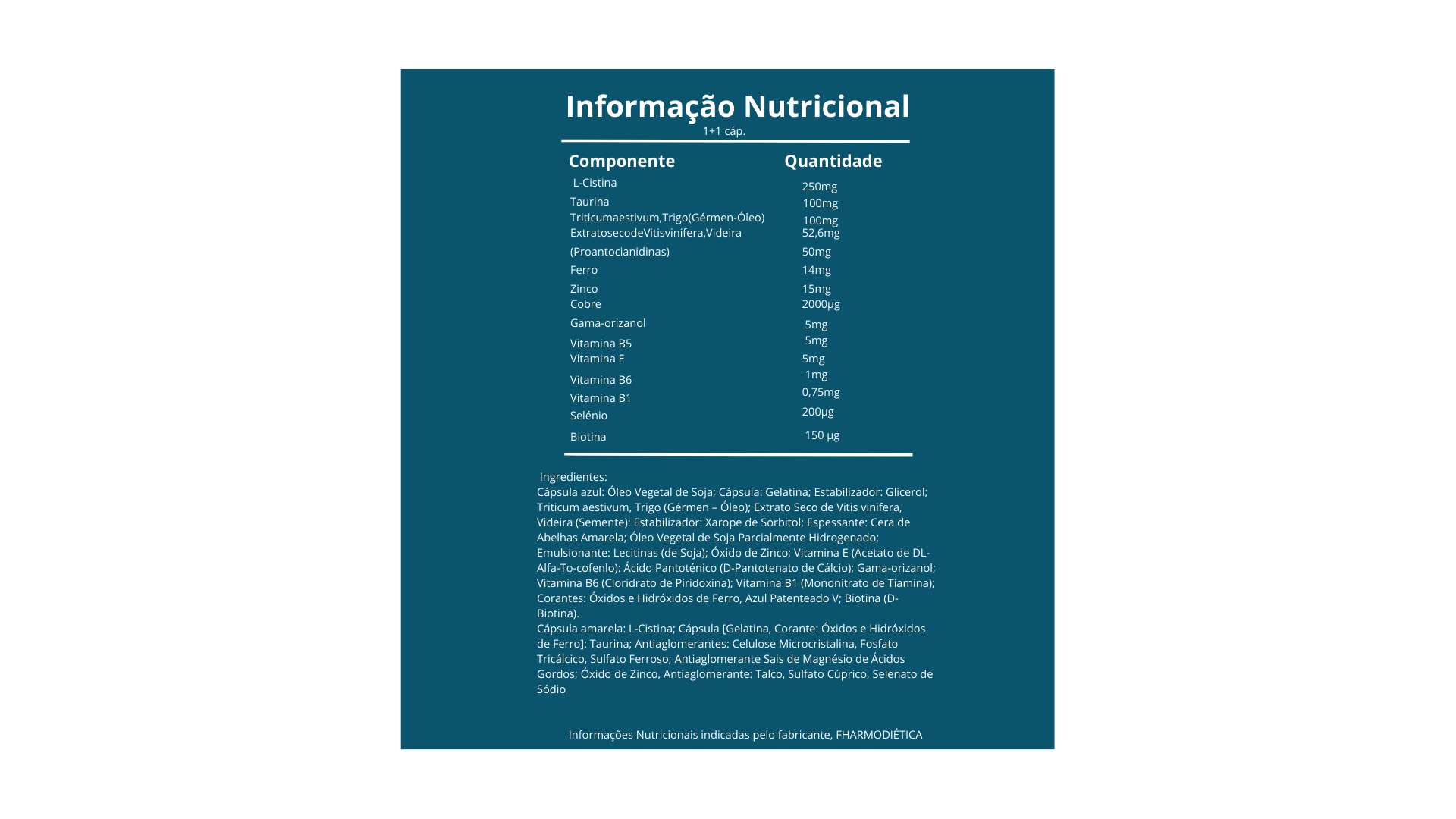 Cápsula azul: Óleo Vegetal de Soja; Cápsula: Gelatina; Estabilizador: Glicerol; Triticum aestivum, Trigo (Gérmen – Óleo); Extrato Seco de Vitis vinifera, Videira (Semente): Estabilizador: Xarope de Sorbitol; Espessante: Cera de Abelhas Amarela; Óleo Vegetal de Soja Parcialmente Hidrogenado; Emulsionante: Lecitinas (de Soja); Óxido de Zinco; Vitamina E (Acetato de DL-Alfa-To-cofenlo): Ácido Pantoténico (D-Pantotenato de Cálcio); Gama-orizanol; Vitamina B6 (Cloridrato de Piridoxina); Vitamina B1 (Mononitrato de Tiamina); Corantes: Óxidos e Hidróxidos de Ferro, Azul Patenteado V; Biotina (D-Biotina).