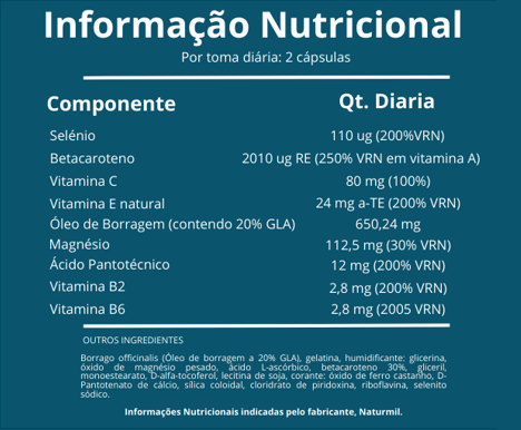 Borrago officinalis (Óleo de borragem a 20% GLA), gelatina, humidificante: glicerina, óxido de magnésio pesado, ácido L-ascórbico, betacaroteno 30%, gliceril monoestearato, D-alfa-tocoferol, lecitina de soja, corante: óxido de ferro castanho, D-Pantotenato de cálcio, sílica coloidal, cloridrato de piridoxina, riboflavina, selenito sódico.