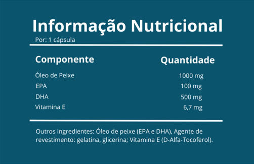 Óleo de peixe (teor mínimo de 10% de EPA e 50% de DHA) 71,74%, agentes de revestimento: gelatina, glicerina, vitamina E (D-alfa-Tocoferol) 0,72%.