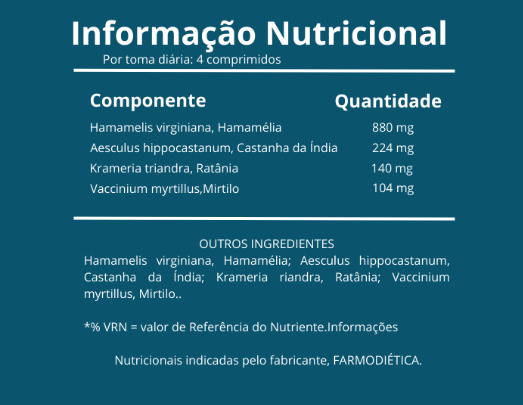 Hamamelis virginiana, Hamamélia; Aesculus hippocastanum, Castanha da Índia; Krameria triandra, Ratânia; Vaccinium myrtillus, Mirtilo.