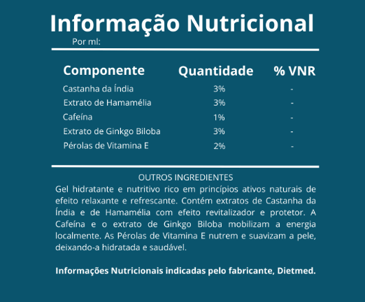 Extrato de Castanha da Índia 3%, Extrato de Hamamélia 3%, Cafeína 1%, Extrato de Ginkgo Biloba 3%, Pérolas de Vitaminas 2% (Vitamina E).