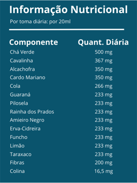 Água, Equisetum arvense (Cavalinha, hidrolato dos caules), Citrus limon (Limão; hidrolato da casca), fibra de Acácia (Acacia senegal), aroma de framboesa/ananás, Cola nitida (Cola; extrato seco 4: 1 das sementes), Camellia sinensis (Chá Verde, extrato seco 8: 1 das folhas), Melissa officinalis (Erva Cidreira, extrato seco 4: 1 das folhas e caules), Foeniculum vulgare Miller (Funcho; extrato seco 4: 1 da planta), Paullinia cupana (Guaraná; extrato seco 5: 1 das sementes), Spiraea ulmaria (Rainha dos Prados; extrato seco 5: 1 das sumidades floridas), Rhamnus frangula (Amieiro Negro; extrato seco 5: 1 da casca), Hieracium pilosella (Pilosela; extrato seco 6: 1 da planta), Cynara scolymus (Alcachofra; extrato seco 10: 1 da planta), conservante: benzoato de sódio, Taraxacum officinale (Taraxaco; extrato seco 10: 1 das raízes), bitartarato de colina, conservante: sorbato de potássio, Silybum marianum (Cardo Mariano; extrato seco 25: 1 da planta), regulador de acidez: ácido cítrico, edulcorantes: acesulfame K e sucralose.