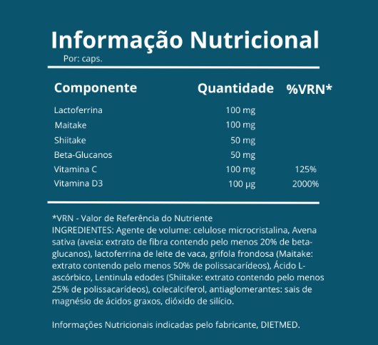 Agente de volume: celulose microcristalina, Avena sativa (aveia: extrato de fibra contendo pelo menos 20% de beta-glucanos), lactoferrina de leite de vaca, grifola frondosa (Maitake: extrato contendo pelo menos 50% de polissacarídeos), Ácido L-ascórbico, Lentinula edodes (Shiitake: extrato contendo pelo menos 25% de polissacarídeos), colecalciferol, antiaglomerantes: sais de magnésio de ácidos graxos, dióxido de silício.