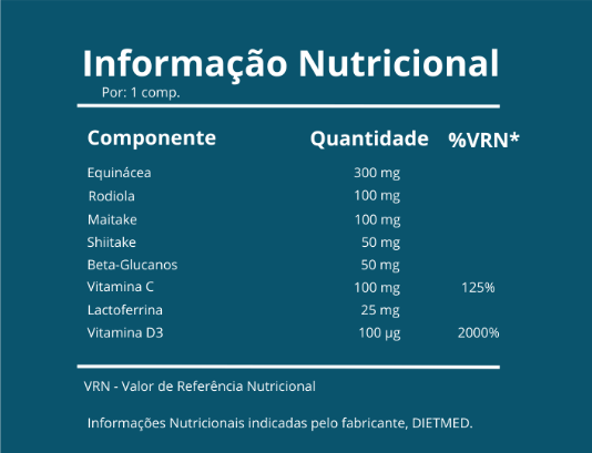 Echinacea angustifolia (Equinácia; extrato da raiz), Avena sativa (Aveia: extrato da fibra contendo pelo menos 20% de Beta-Glucanos), agente de volume: celulose microcristalina, ácido L- ascórbico, Grifola frondosa (Maitake: extrato contendo pelo menos 50% de polissacáridos), Rhodiola rosea (Rodiola; extrato seco da raiz contendo pelo menos 3% de rosavina e 1% de salidrósido), Lentinula edodes (Shiitake: extrato contendo pelo menos 25% de polissacáridos), colecalciferol, lactoferrina de leite de vaca, antiaglomerantes: sais de magnésio de ácidos gordos, dióxido de silício.