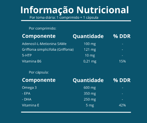 A sua composição contém SAMe, Griffonia, Vitamina E e B6 e Omega 3: