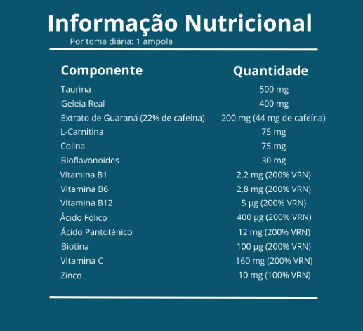 Este produto contém uma combinação especial de ingredientes naturais e vitaminas essenciais. Cada dose inclui 520mg de Taurina, 450mg de Geleia Real, 200mg de Extrato de Guaraná (equivalente a 44mg de cafeína), 90mg de L-Carnitina e 75mg de Colina. Adicionalmente, estão presentes vitaminas e minerais vitais para o corpo, como 2,2mg de Vitamina B1, 30mg de Bioflavonoides, 12mg de Ácido Pantoténico, 2,8mg de Vitamina B6, 400µg de Ácido Fólico, 5µg de Vitamina B12, 100µg de Biotina, 160mg de Vitamina C e 10mg de Zinco.