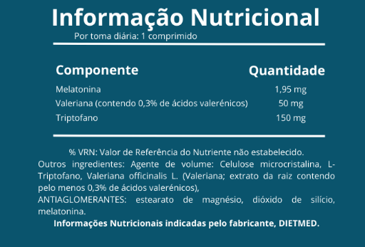 Agende de volume; Celulose microcristalina; L-Triptofano; Valeriana officinalis L. (Valeriana, extracto da raiz contento pelo menos 0,3% de ácidos valerénicos); Antiaglomerantes: Sais de magnésio de ácidos gordos; Dióxido de silício; Melatonina.