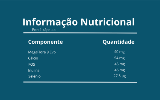 Carbonato de Cálcio; Agente de Revestimento : Gelatina; Agente de Volume: Celulose Microcristalina; FOS (Frutooligossacarídeos); Inulina; MegaFlora 9 Evo® (Bifidobacterium lactis W51, Bifidobacterium lactis W52, Enterococcus faecium W54, Lactobacillus parcasei W20, Lactobacillus salivarius W24, Lactococcus lactis W19, Lactobacillus plantarum W1, Lactobacillus plantarum W21, Lactobacillus acidophilus W22); Agente de volume: Maltodextrina; Levedura de Selénio (teor de 0,2% Selénio); Antiaglomerante: Sais de Magnésio de ácidos Gordos.
