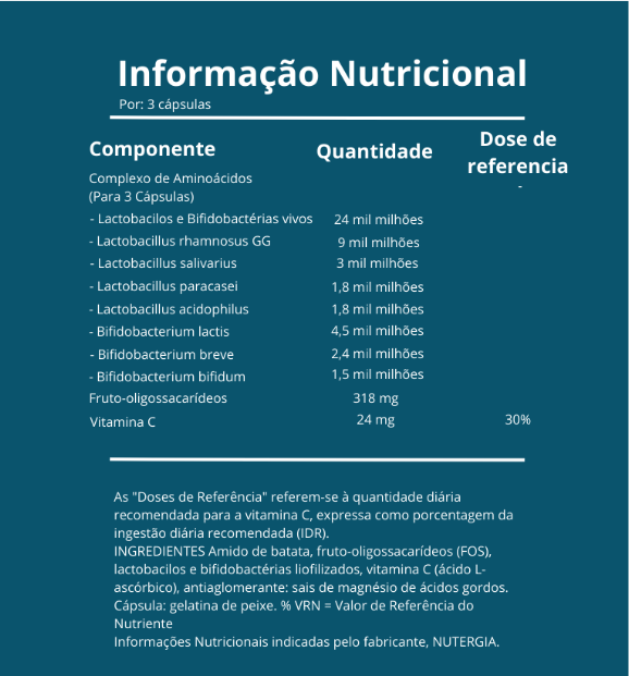 Agente de carga: amido de batata; frutooligosacarídios (FOS), lactobacilos e bifidos liofilizados (Lactobacillus rhamnosus GG*, L. paracasei, L. acidophilus, Bifidobacterium bifidum), antiaglomerante: estearato de magnésio vegetal; antioxidante: vitamina C.