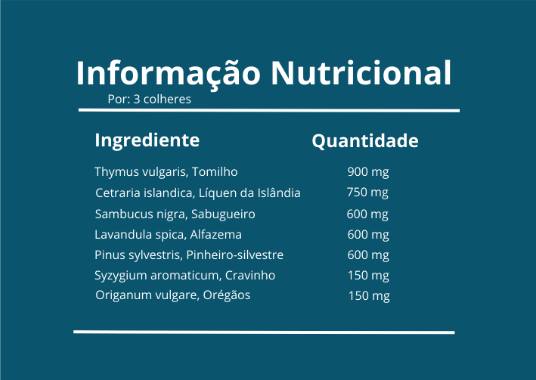 Cada 30 ml contém uma combinação equilibrada de ingredientes naturais, incluindo Tomilho (Thymus vulgaris), Líquen da Islândia (Cetraria islandica), Sabugueiro (Sambucus nigra), Alfazema (Lavandula spica), Pinheiro-silvestre (Pinus sylvestris), Cravinho (Syzygium aromaticum) e Orégãos (Origanum vulgare).