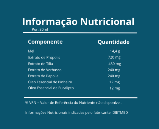 Mel 120 g, Extrato de Propolis 6 g, Extrato de Tília (Tilia argentea; inflorescências) 4 g, Extrato de Verbasco (Verbascum thapsus L.; flores e folhas) 2 g, Extrato de Papoila Vermelha (Papaver rhoeas L.; flores) 2 g, Óleo Essencial de Pinheiro (Pinus sylvestris) 100 mg, Óleo Essencial de Eucalipto (Eucalyptus globulus labill.) 100 mg, Excipiente q.b.p. 250 ml.