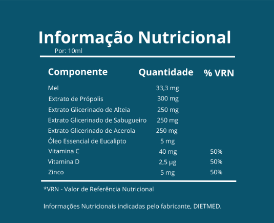 Cada dose de 10 ml contém uma combinação cuidadosamente selecionada de ingredientes naturais, incluindo mel, extrato glicerinado de própolis, extrato glicerinado de alteia, extrato glicerinado de sabugueiro, extrato glicerinado de acerola, óleo essencial de eucalipto, vitamina C, vitamina D e zinco.